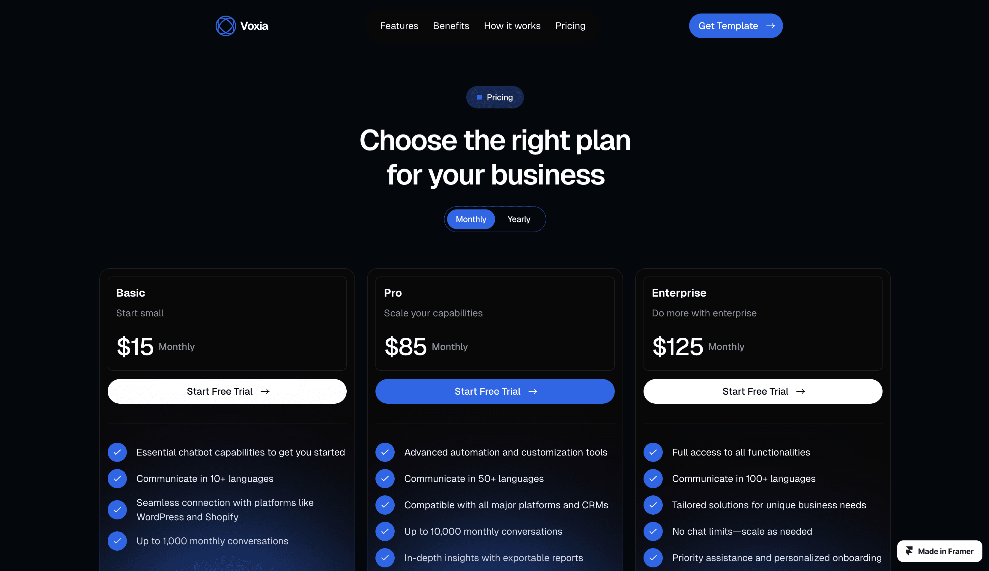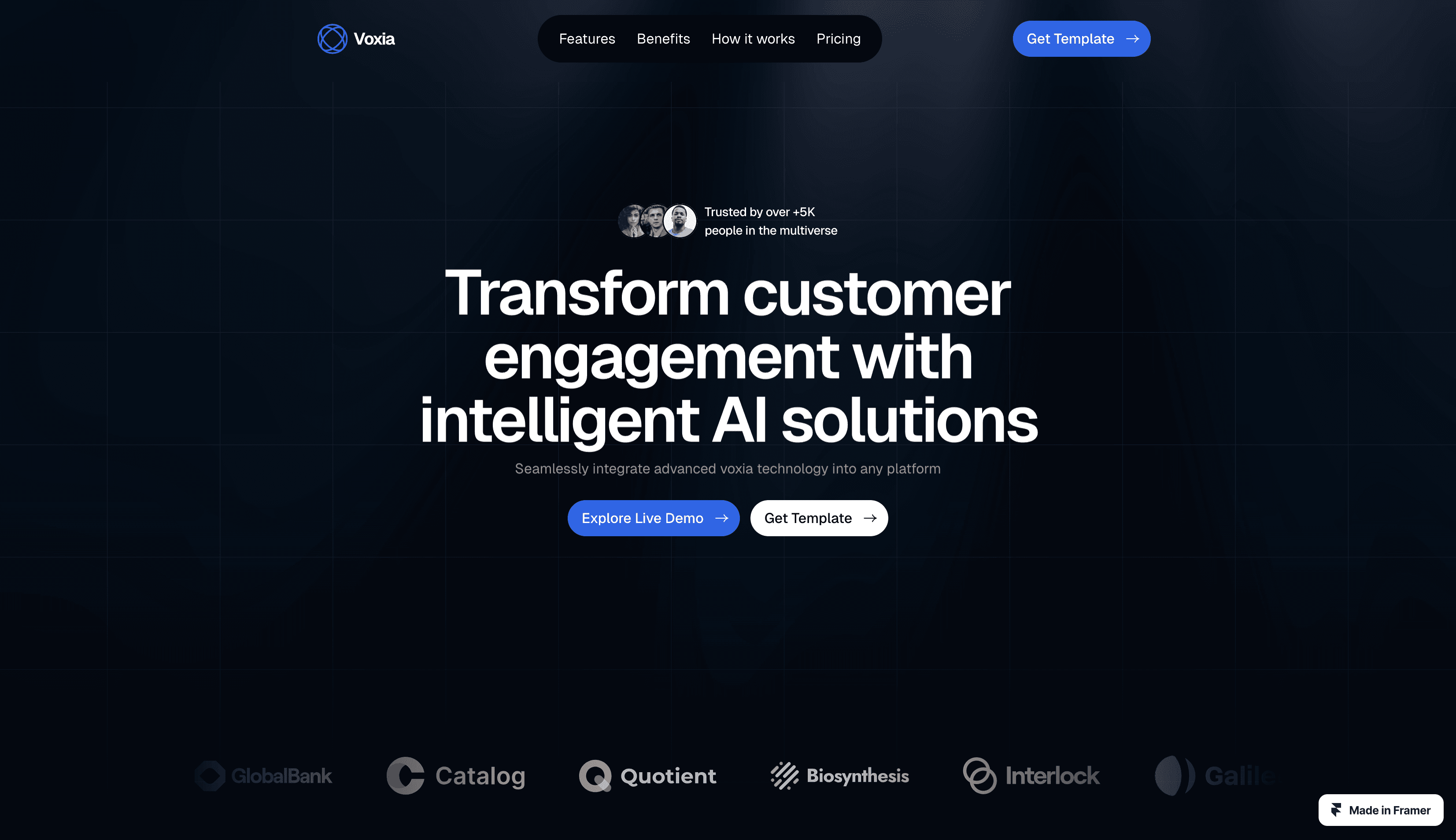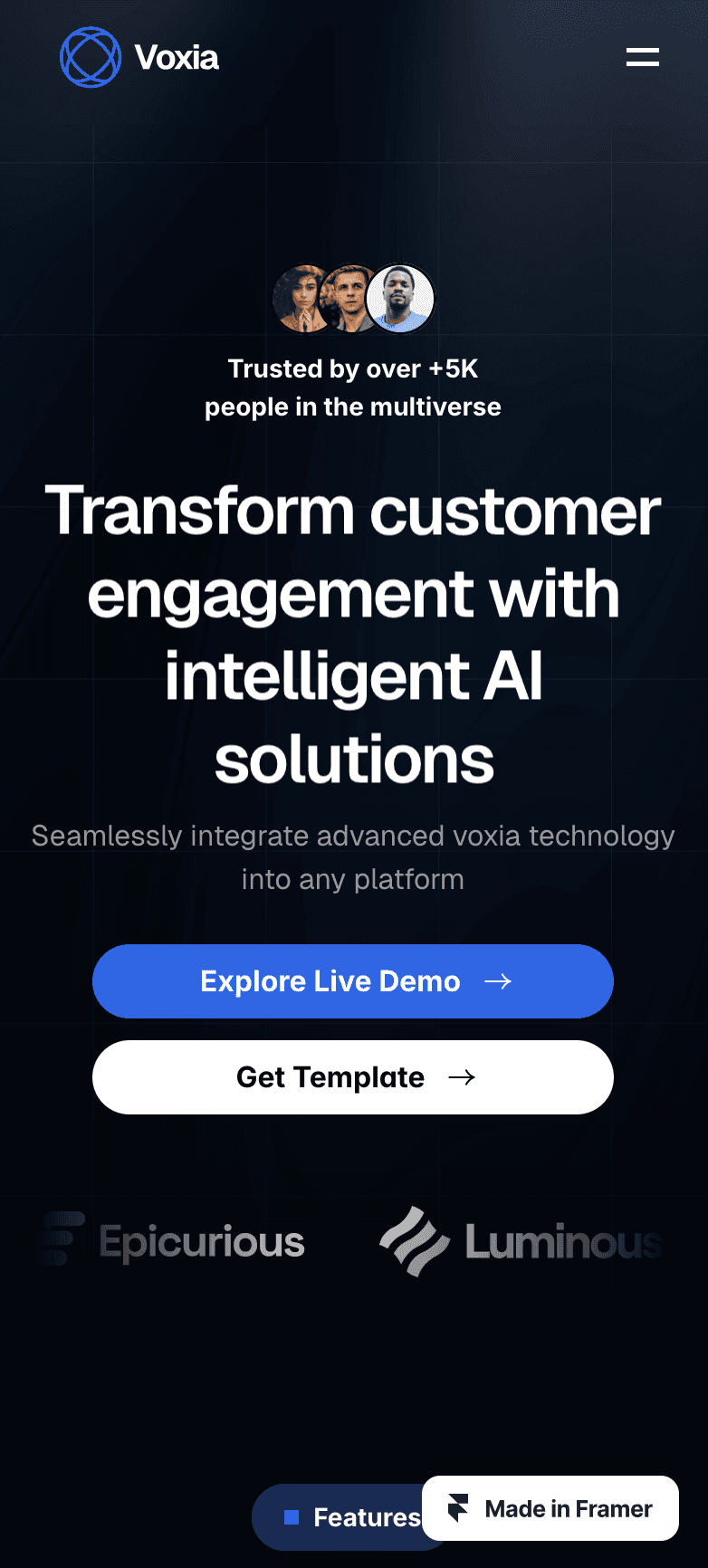 An intelligent AI Chatbot SaaS Framer template with multilingual support, platform integration, analytics, and customizable branding.