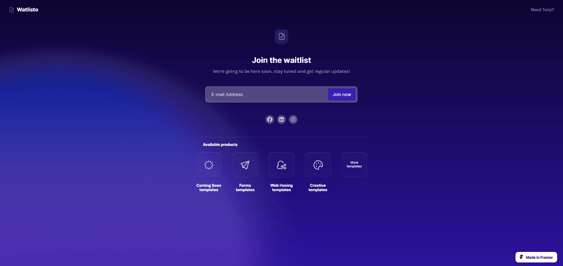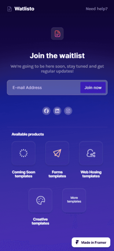 An animated dark-mode waitlist form template comes with two variants of colors, easy to customize, easy to implement social media links with ready pre-packed social media icons, and more.